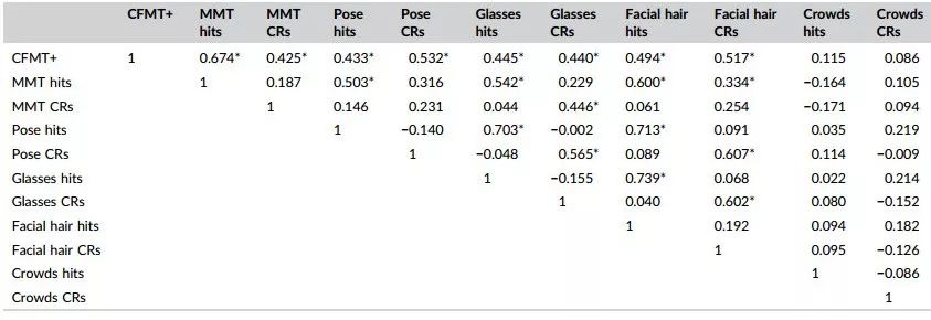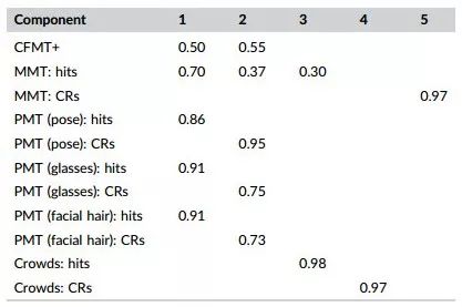 第一个因素来自于目标当前的措施:命中了PMT的三个块,命中了MMT,以及CFMT的总体性能。第二个因素来自三个匹配块的正确的拒绝分数,以及来自CFMT的总体分数。在人群测试中,第三和第四个因素分别代表了成功和正确的拒绝;第五个因素对MMT的正确拒绝有很高的负载。下表显示了一个完整的相关矩阵。