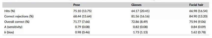 我们的下一组分析检查了三个新的人脸匹配测试块(即姿态、眼镜和面部毛发)的性能一致性。每个块上所有参与者的命中、正确拒绝和总体准确性被总结,并使用控制数据计算每个度量的规范。
