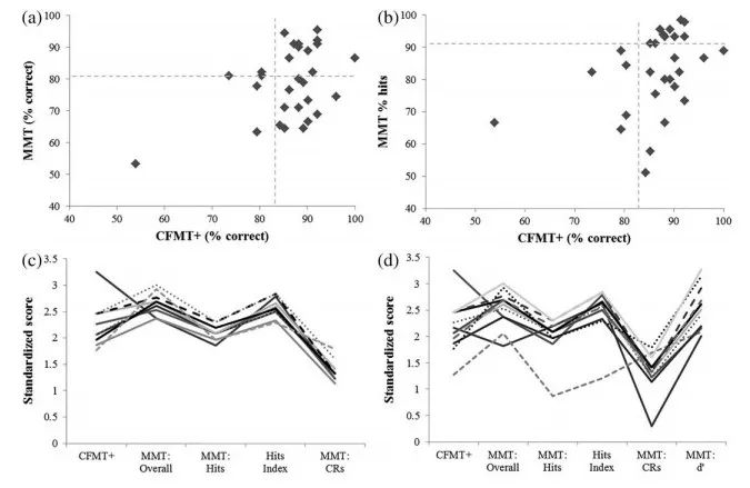 在MMT上的总正确百分比是通过总结命中和正确的拒绝来计算的。每项措施的标准从控制平均数确定为1.96 SDS(见下表)。警官得分在53.33%~95.56%之间,有14人超标。这些人员中有11人按照CFMT的自由纳入标准也优于对照组(其中9人也超过了对照平均数的1.96 SDS),而3人没有(得分明显在典型范围内:73.53%、80.39%和80.39%)。超过自由CFMT标准的12名官员(8名超过1.96 SDS)在MMT上没有这样做,得分从64.44%到80.00%不等(见下图)。