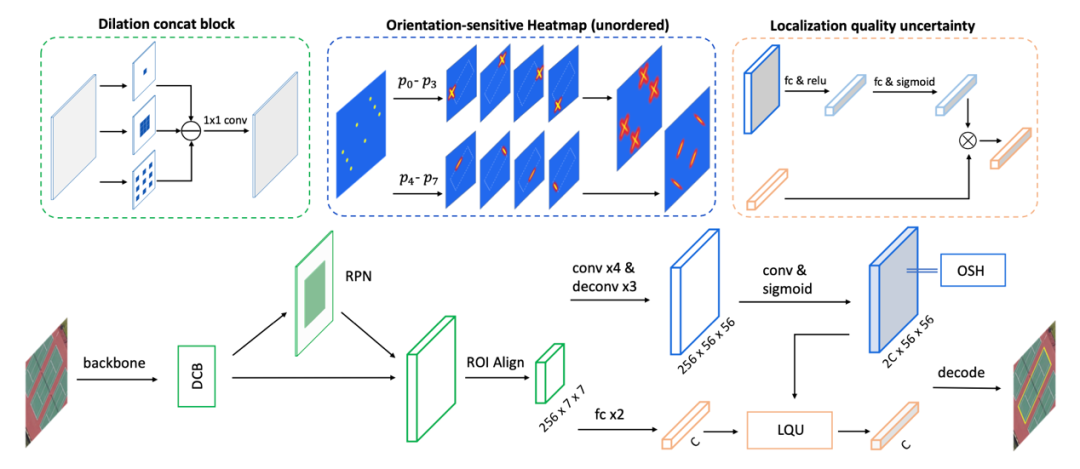 OSKDet模型框架如下图所示,整体架构基于Grid RCNN,在一阶段,模型回归出目标的最小外接水平矩形,通过ROI Align提取特征后,在二阶段回归目标旋转框上8个关键点热力图来组成旋转目标。整个模型共包含方向敏感热力图、无序关键点表示以及定位质量不确定性模块等三部分。