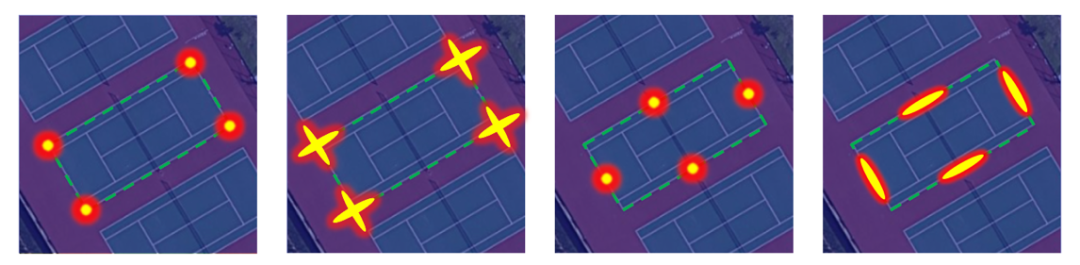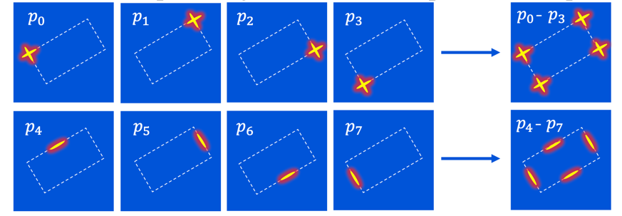 传统的高斯热力图没有考虑到目标的方向和形状信息,该论文提出了一种方向敏感热力图,通过对高斯热力图进行缩放和旋转,来匹配目标的边缘形状,对目标进行更精准的表征,如下图所示。具体表现为,在目标顶点,生成热力图为旋转十字型;在目标边缘中点,生成热力图为旋转一字型,通过对标准高斯分布的空间变换,在目标边缘方向上,高斯核具有更大的方差,使网络能够更加关注边缘方向上的空间特征。