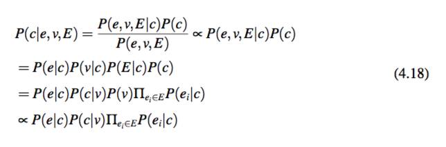 本节的方法 本节在上下文中增加了动词作为附加信息来实体概念化 e。当 e 是一个动词的对象的时候,利用动词模板可以推导出 P(c|v),即在给定动词 v 的动词短语下观察到有关概念 c 的实体概念化模板的概率。因此,在给定上下文 E 和实体 e 还有动词 v 的情况下,概念 c 出现的概率是 P(c|e,v,E)。类似于等式 4.17,P(c|e,v,E) 可以通过以下公式来计算: