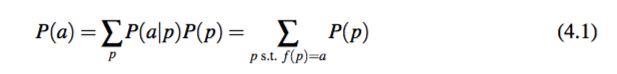 这里 P(p) 是给定动词的短语分布。注意这里的第二个等式是成立的,因为当f(p) =a 时,P(a|p) = 1。P(p) 可以直接由 p 的频率得到,见公式 4.14。