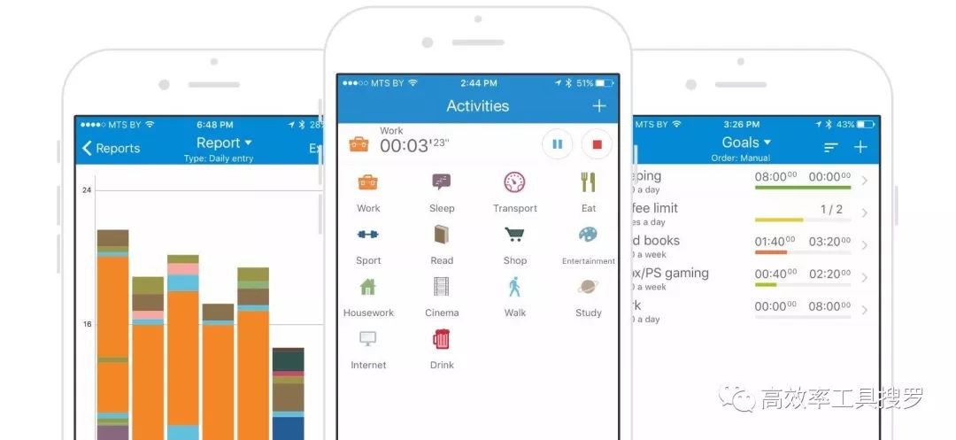 它上面包含了很多种类型的活动,你只需要轻轻点击就可以开始统计。当然你也可以建立自己的活动类型。