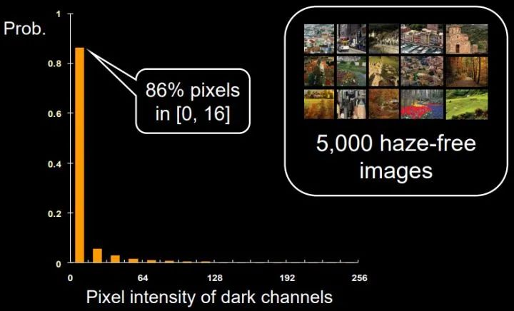 kaiming he通过大量无雾图片统计发现了dark channel prior—在无雾图的局部区域中,3个通道的最小亮度值非常小接近于0(不包括天空区域)。