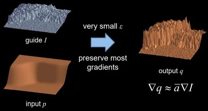Guided image filtering是结合两幅图片信息的过程,一个filtering input image(表示为p)和一个guide image(表示为I)生成一个filtering output image(表示为q)。p决定了q的颜色,亮度,和色调,I决定了q的边缘。对于图像去雾来说,transmission就是p,雾图就是I,refined transmission就是q。