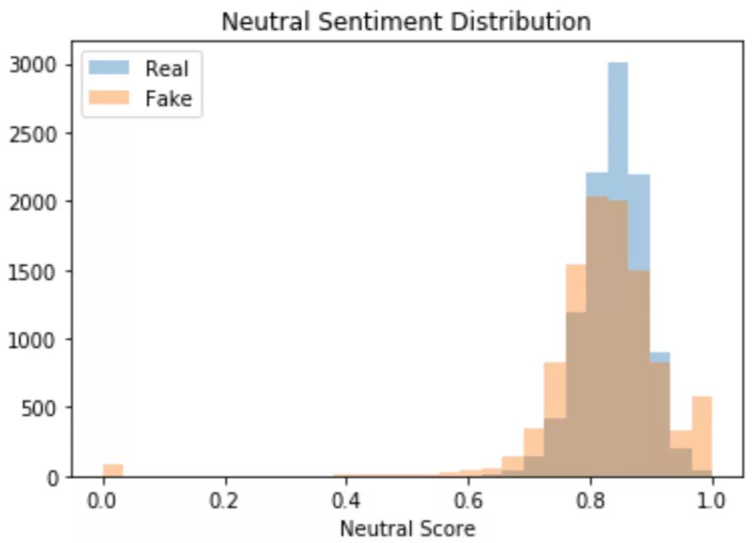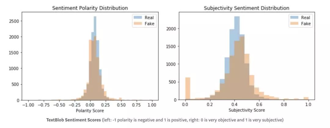 情感分析是 NLP 中的另一种分析工具,它可以量化文章中的情绪并评分。我们在这里使用了两个包,TextBlob 和 Natural Language Toolkit 的 Vader 。它们都是分析文中情绪的工具。 Vader 会针对文章的偏激性和中立性进行测量和评分,而 TextBlob 则会测量文章的偏激性和整体主观性。我们原本猜想这些情绪分布会根据文章的真实性和误导性有大幅变化,但在实际情况中我们发现这种差异并不明显。