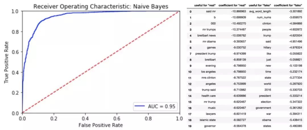 左:多项朴素贝叶斯的 ROC 曲线;右:朴素贝叶斯分类器中排名前20的特征