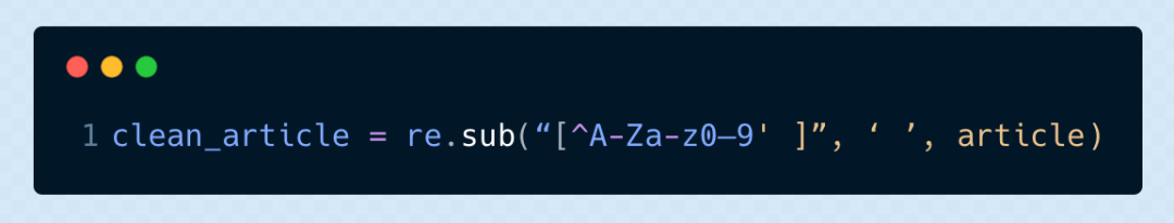 在大部分以数据为主体的项目中,第一道工序便是数据清洗。在鉴别虚假新闻时,我们需要处理成千上万篇来自不同领域、有着不同清晰度的文章。 为了有效筛选需要的内容,我们使用正则表达式来提取分析中所需要的字符串类型。例如,这是一行使用 re python 模块的代码: