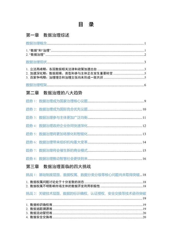 当前,国内外在数据治理的理论、技术、规则和应用等方面准备不足,实践中遇到越来越多的问题。本报告将站在中长期发展的视角,总结当前及未来一段时间内数据治理发展的八大趋势,以及在基础制度、关键技术、市场产业和国际社会等层面面临的四大挑战,并提出当前亟待研究解决的五个重要问题,以期为各方研究和讨论完善数据治理体系以及相关重大议题提供有益支撑。