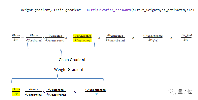 在multiplication_backward的情况下,返回2个参数,一个是相对于权重的梯度(dLoss / dV),另一个是链梯度(chain gradient),该链梯度将成为计算另一个权重梯度的链的一部分。
