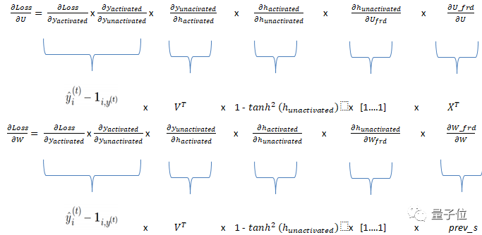 由于RNN中存在三个权重,因此我们需要三个梯度。input_weights(dLoss / dU),internal_state_weights(dLoss / dW)和output_weights(dLoss / dV)的梯度。