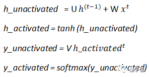 U代表输入权重、W代表内部状态权重,V代表输出权重。