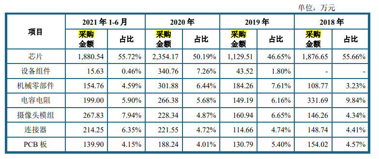 影响毛利浮动的背后是成本。思林杰的成本主要由直接材料、直接人工、制造费用及其他构成。其中,直接材料成本占比最高,达80%。如果再细究直接材料成本的构成,可发现包括了芯片、电容、电阻、PCB 板、连接器、机械材料、辅材包材等。