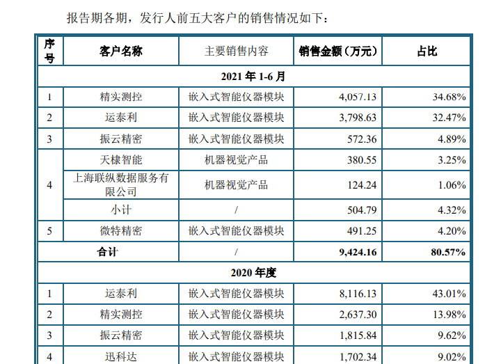 尤其体现在前两大客户——精实测控、运泰利,去年上半年,公司对这两大客户的销售金额最高,且占比均超过30%。