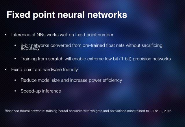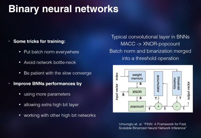 所以这一个工作是把这个网络定点化,第一步主要是把这些参数进行量化,这一系列的工作我觉得到极致了,就是可以 binary——二值化的网络。如果你把网络结构每个参数、每个权重都二值化,这样就非常非理想,适合用硬件去实现,而且效率就会高很多。
