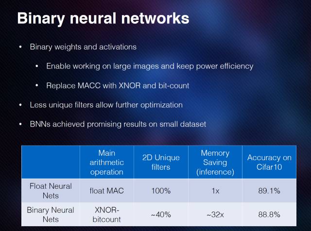 有一些比较新的工作证明至少目前在一些小的集合上,比如 Cifar 10,它的性能跟浮点是很接近的。它的存储空间可以想象一下,如果从 32 位浮点直接变成二值,大约是能够简化 32 倍了。