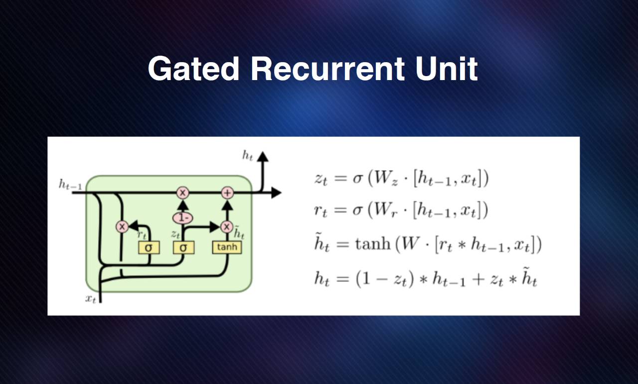 一个比较有意义的变种是它可以把这个 RNN 进一步简化,而且它的性能可能接近的就是 gated recurrent network、gated recurrent unit。就相当于把刚才有三个这种控制的门,forgetting gate、input、output。把它合并成两个,变成 zt 跟 rt,其中一个还是控制输出。另外一个就是说,原来是 ft 跟那个 rt 两个数字去控制哪些信息继续保留,那么现在要合并成一个 zt。就是说我只考虑这一个因素。你哪些信息保留,1-Zt 跟那个 Zt 平均一下。我觉得目前看来这是比较 promising(有前途)的一个改进了。它进一步简化了,而且建模能力还是相当的。