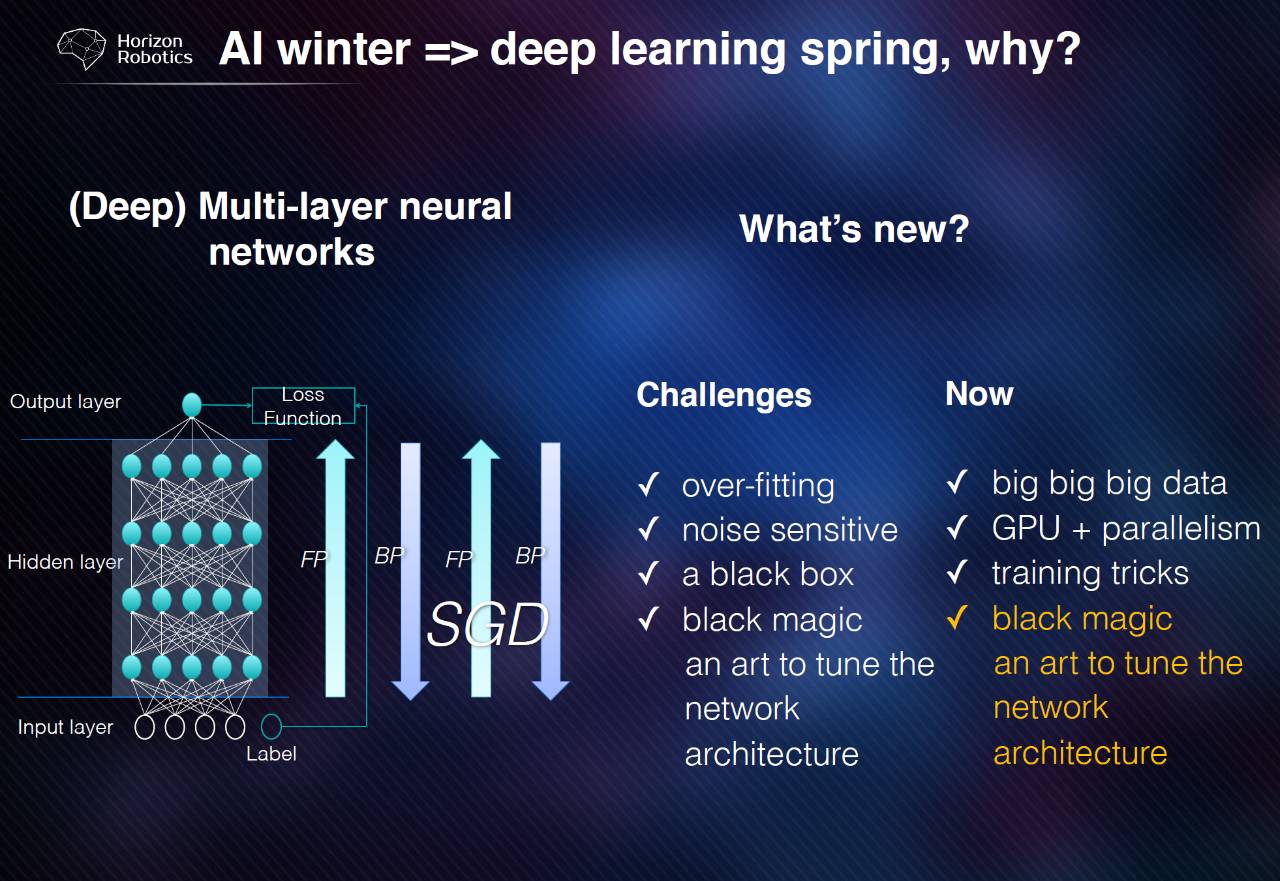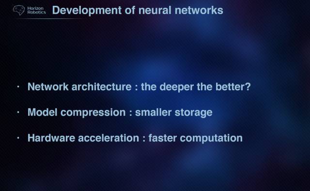 第二,深度学习很强大,它的模型或者说网络结构很深,参数很多,其实运算复杂度以及存储复杂度很高了。我们能否把模型的规模精简,这也是一个发展的方向。