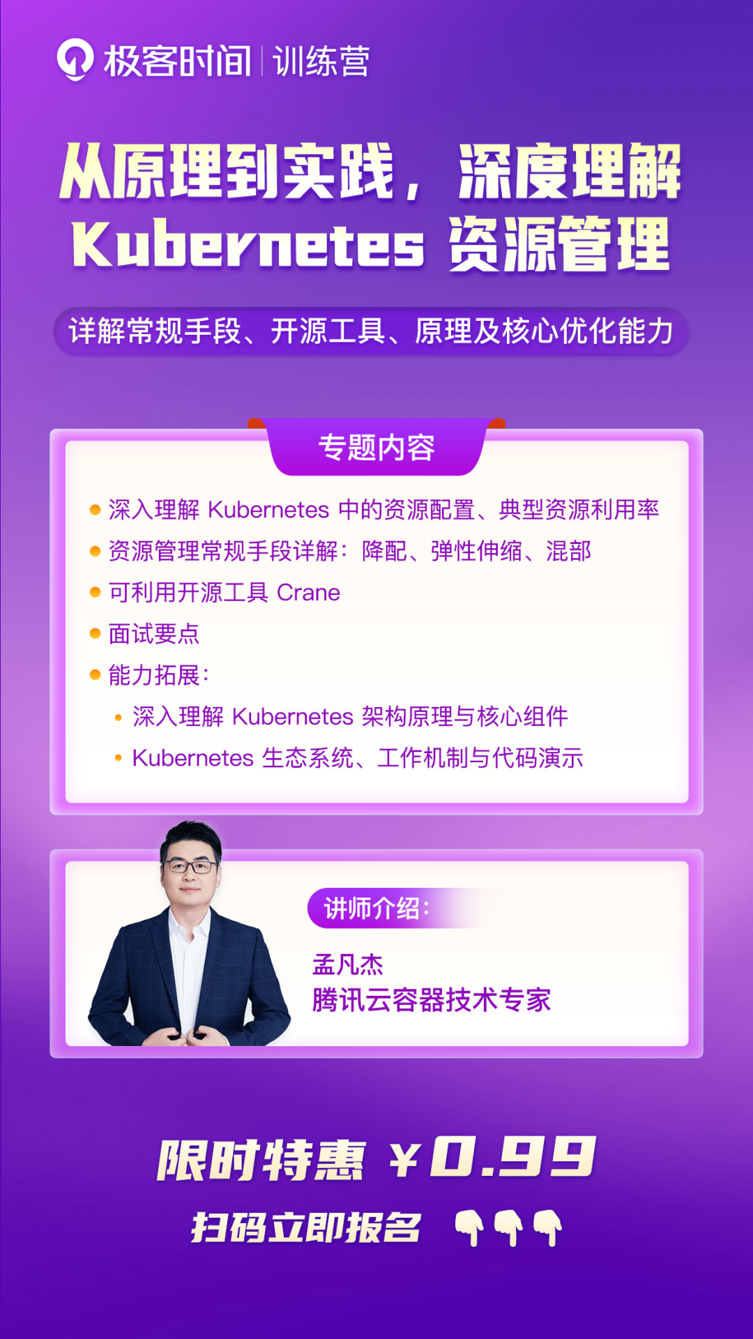 孟凡杰老师在腾讯云负责的就是降本产品的研发,对于 K8s 的资源管理有着深刻认知,带着一线大厂的一手实战经验,给你讲透 K8s,错过实在可惜!