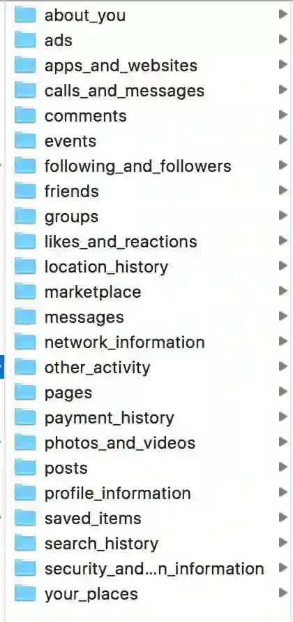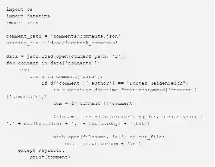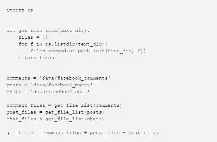 我打算下载所有的 Facebook 数据,但是我并不希望在这个课题中使用所有的 Facebook 数据。对这个课题而言,我只关心我的帖子,评论和聊天历史。为了做到这些,我为每个种类的数据写了一个预处理脚本来下载所需要的内容到文本文件。