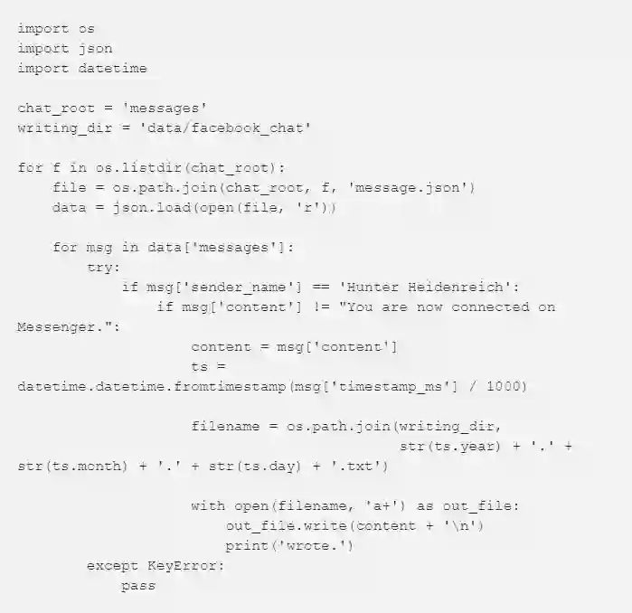 你在这里会看到的是我正在遍历我的 messages 文件夹中的所有子文件夹。我从那里做的是我在信息 JSON 中读到的。对于每个可用的信息,我会检查它是否是我发送的信息。如果它不是 Facebook 默认的“You are now connected on Messenger”。接着我会使用它。我给信息添加时间戳,然后将其添加到采用 year.month.day.txt 格式的文件中,这是我标记所有文本文件的格式,以便我可以记录词汇随时间的变化。
