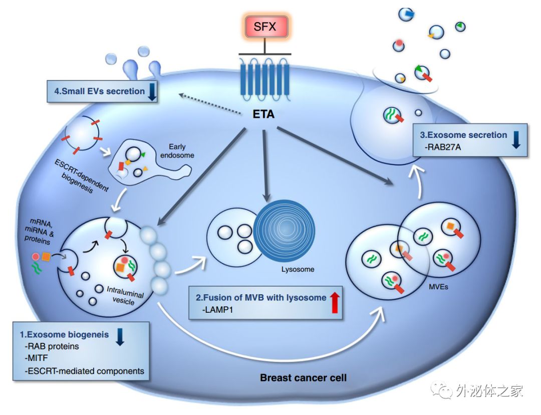 SFX介导的MDA-MB231癌细胞中sEV分泌抑制的模式图。SFX通过ETA结合和随后的干扰,降低了参与sEV生物合成和分泌的蛋白质的表达,增加了MVE与溶酶体的融合,最终减少了乳腺癌细胞分泌的sEV的数量。