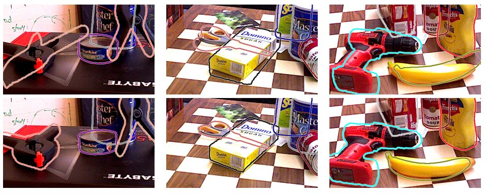 与YCB-Video上的PoseCNN比较。第一行、第二行分别为PoseCNN的结果和我们的方法的结果。证明了特别是在存在大的遮挡时,使用局部对象部分的好处。