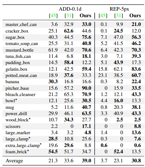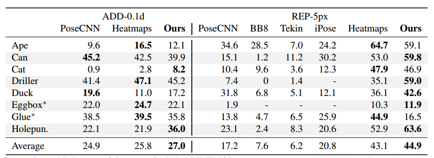 在具有挑战性的OccludedLINEMOD和YCB-Video数据集上评估提出的多物体6D姿态估计方法。REP error它反应了二维重投影误差,由估计的3D模型点的二维投影点与groundtruth之间的平均误差构成,单位是像素。