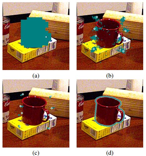 (d)针对2D-3D关键点对,利用基于RANSAC的PnP产生准确的姿势估计,如图上绘制的轮廓。