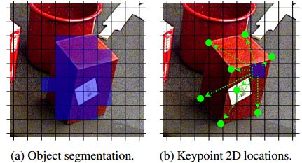 网络架构有两个分支流:一个用于对象分割,另一个用于2D关键点检测。这两个流共享一个公共编码器(encoder),但解码器是分开的。分割流(Segment pipeline)预测在每个网格位置处观察到的对象的语义标签。关键点检测流(Keypoint pipeline)预测该对象的2D关键点位置。