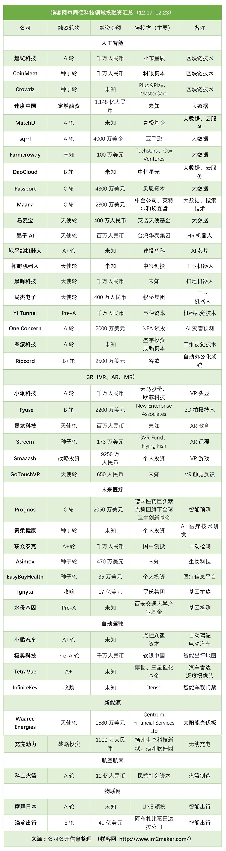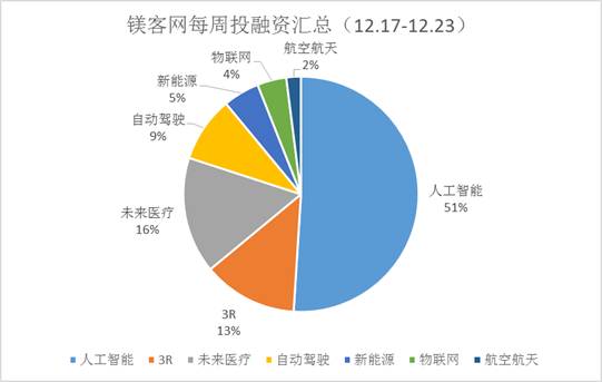 未来医疗融资数量稳定增长,本周有7起融资,主要集中在医疗检测方面。除此之外,自动驾驶、新能源以及物联网、航空航天领域都有融资事件发生。