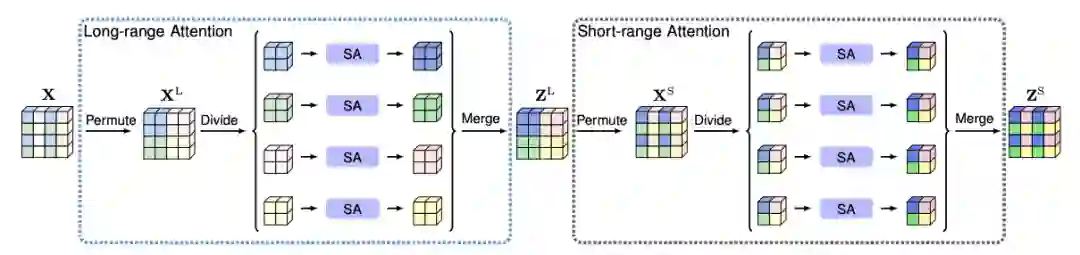 PKU兄弟实验室的 ISA[18]也是将 attention map 的全图计算分解为两步:第一步长距离attention ,第二步短距离。中间夹着一步 permute 操作。其实类似组卷积- shuffle -组卷积的过程,思路上顺承 IGCV[19],其复杂度也是 。