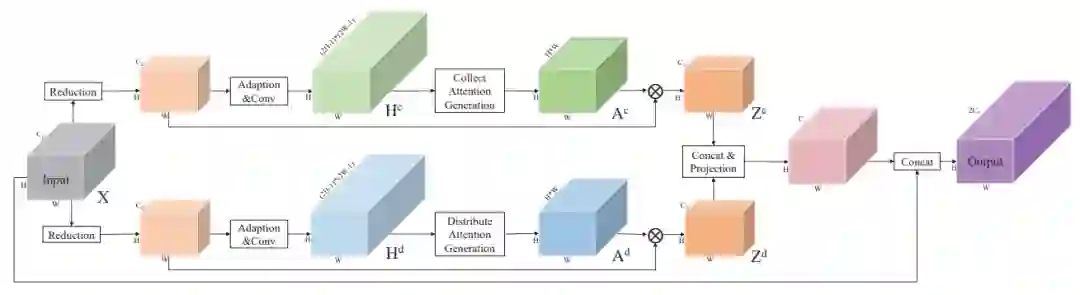 ,只和 query 及相对位置相关。此外,PSANet 包含两路 attention ,相当于 transformer 中的两个 head 。两路分别起到 collect 和 distribute 的作用。