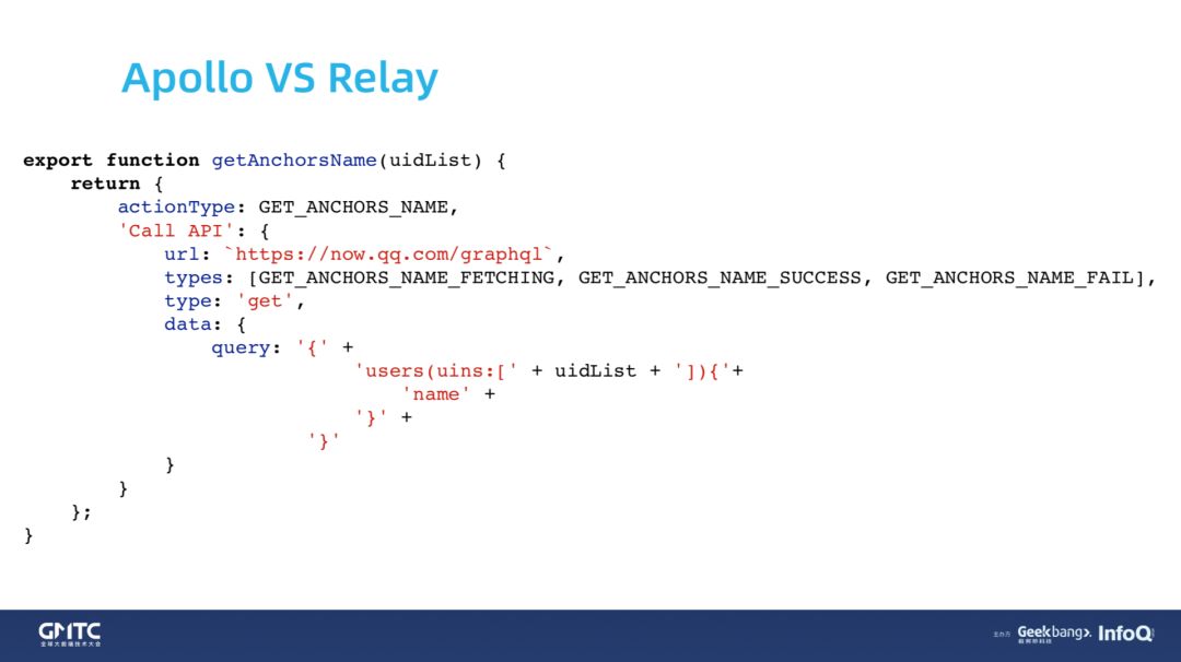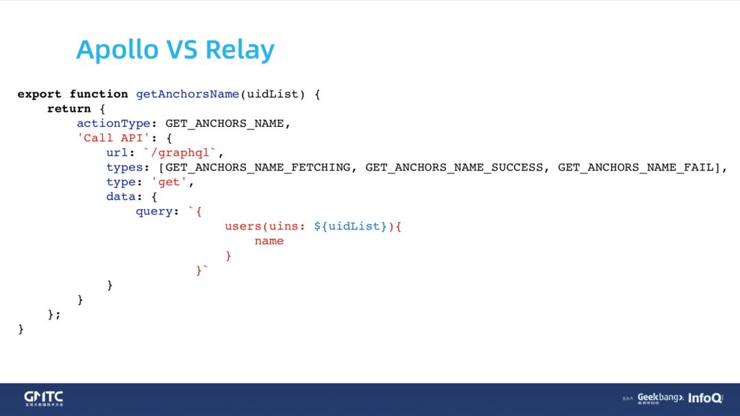 这是 Relay 的 GraphQL 形式,它实际是 Query 是通过一个 React Apollo 这样的组件发起的,然后直接把后端请求的数据以 props 的形式传递到真正的业务组件里面去。