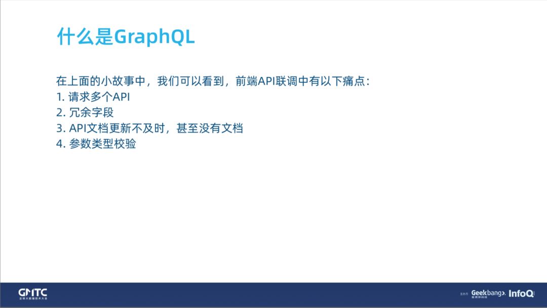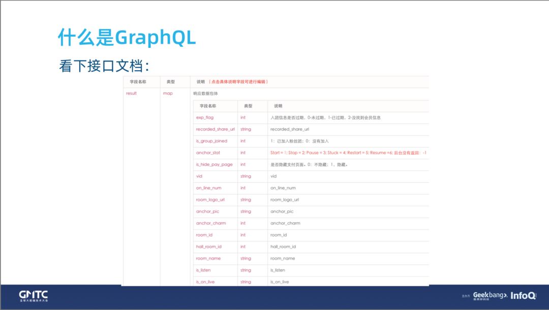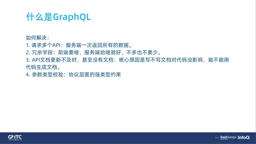 针对 API 文档更新不及时,GraphQL 的解决方案是,在写好后端代码后,不需要写接口文档,因为已经和前端的同学定义好字段的类型。写过 TypeScript 的同学应该知道,每个字段对应的是一个强类型的字段校验规则。其次,利用 GraphQL 的自检性,你就可以完全的看到这个接口可以提供哪些字段,每个字段代表的含义是什么,每个字段返回的参数的类型是什么,以及它可以接收怎样的参数。