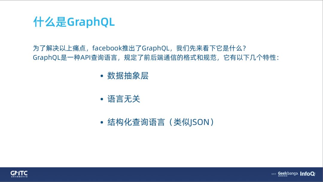 GraphQL 的定义是一种 API 查询语言,它其实是一种语言的规范,跟具体的实现是没有关系的。而且它是一层非常薄的数据抽象层,它既不会负责存储数据,也不会负责渲染数据;简单说就是一层 Proxy(代理),它把后端的数据做一些聚合、校验、判断,再返回给前端。对于前端来说,它是一种结构化的查询语言,长得很像 JSON,其实不是。