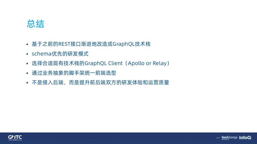 这是前端的一个比较,对于在后端的业务迁移来说,我个人的建议是,前端同学可以先把现有的 HTTP 的后台接口作为 GraphQL Server 的数据源,多一层很薄的一层,然后慢慢的把整个前后端的技术栈往 GraphQL 技术栈平滑迁移,这样的话,你可以一个接口一个接口的迁移,步子不会迈得太大,也不会出太大的问题,改造成本也不会太高。