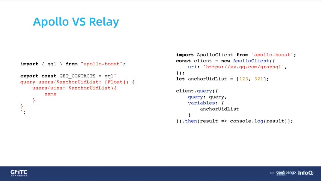 其次,GraphQL 在前端的选型,即 GraphQL Client 端的选型,目前业界最火的有两个方案,一个是 Apollo,另一个是 Relay,我会对比这两个方案,大家可以结合自己的业务作出选择。