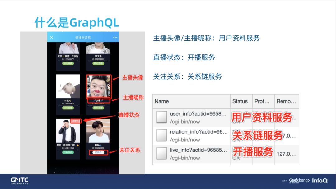 上图就是在前端发起一个 GraphQL 查询的样子,它其实不是 JSON,但是非常像 JSON 包裹起来的。看上图,users 就是 list,它想请求一个用户的列表,那么传入的参数是一个数组,但我这里只传了一个数组元素,这里 unis 即用户唯一标识符。返回的数据就包裹在下面这个花括号里,包括姓名、头像 logo、是否在线、是否在开播,以及用户是不是关注了他(isListen)。