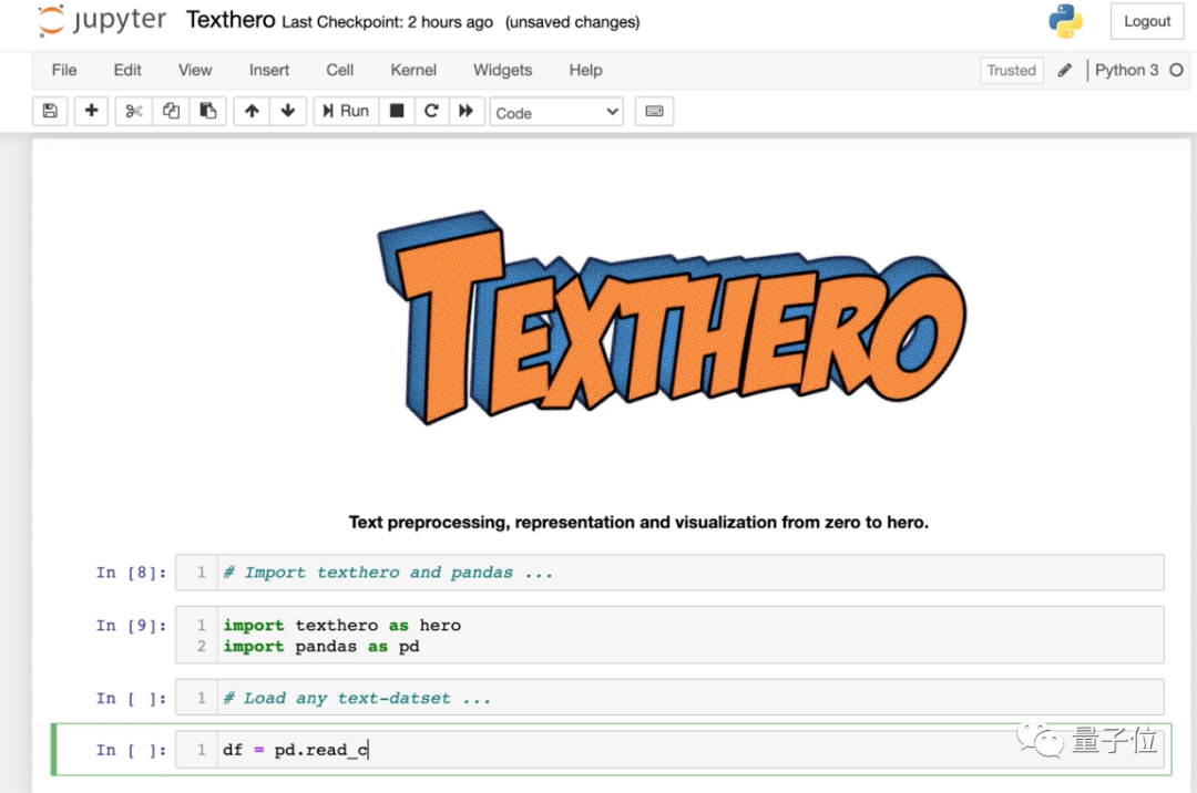 pip一下texthero后(或从GitHub上直接下载工具包,文末附代码链接),采用import导入它和pandas: