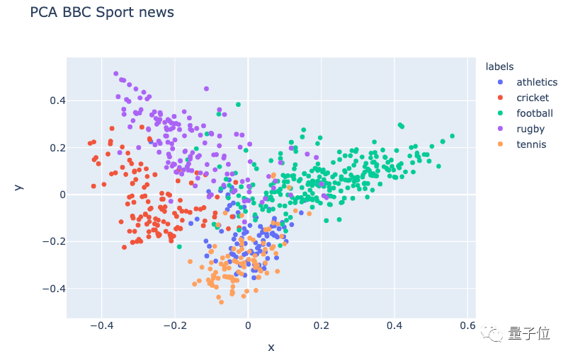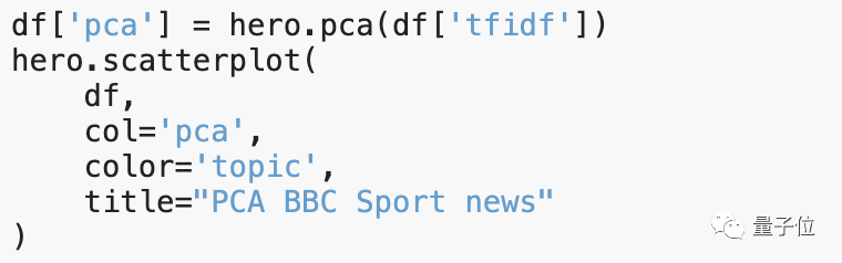 而在可视化方向上,Texthero同样展现出了强大的能力,这里以PCA降维后的结果进行展示:
