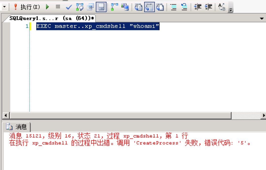 由于反病毒软件会监控xp_cmdshell,一执行就会返回CreateProcess Error Code 5等问题,sp_oacreate是能够解决,但是没有回显,可通过发送网络请求来看。