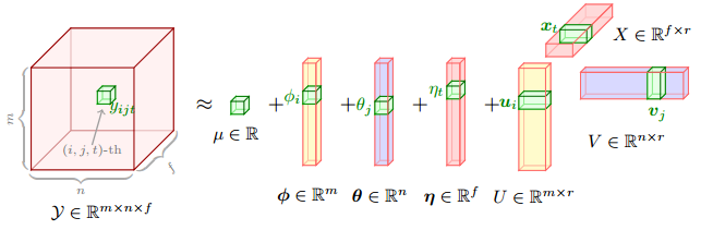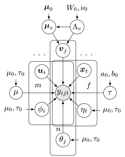 BATF(贝叶斯增广张量分解)模型作为贝叶斯网络和定向因子图。