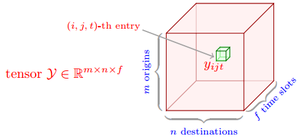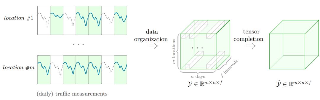 张量补全任务及其框架,包括数据组织和张量补全,其中部分地观察了流量测量。