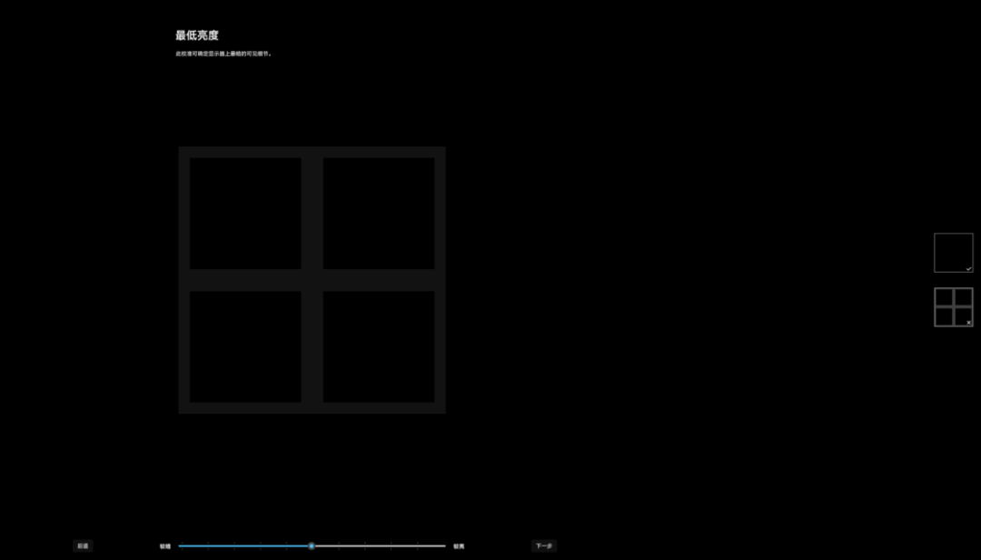 使用 Windows HDR 校准工具的总体流程与 Windows 系统内提供的其他校准工具类似,应用会全屏运行,画面中央为主要调节对象,屏幕右侧则是正确与错误的图像参考。通过几轮简单的对比和设置,我们可以将显示器的 HDR 效果调节到最佳状态。