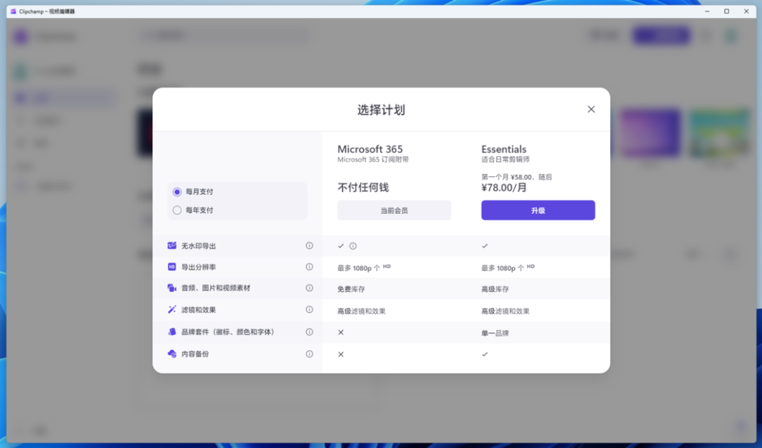 Clipchamp 已经经历过数次调价,此前的免费版权益在 22H2 中被包装成为了 Microsoft 365 订阅附带,付费版 78 元/月,在免费版的基础上可以获得更多在线素材以及品牌套件、内容备份功能。