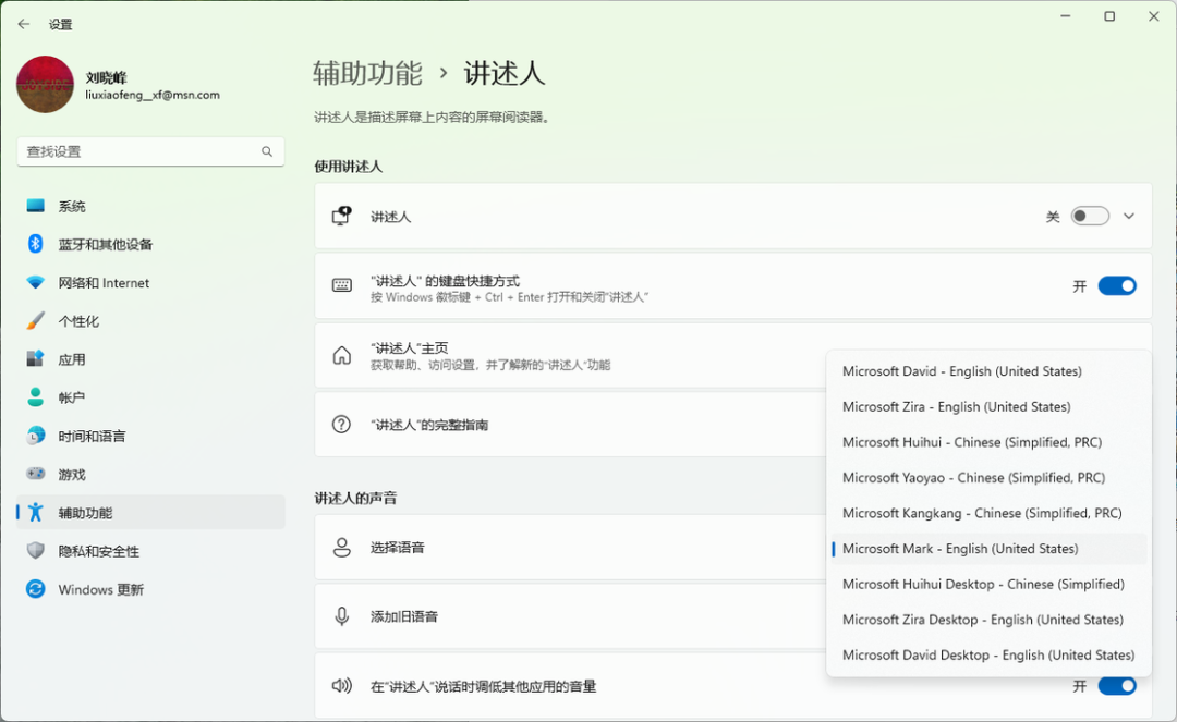 同时讲述人功能也迎来了自然语音生成,如果你用过 Edge 里的「大声朗读」功能,那么你一定会被那个自然的语音语调所震惊。不过为了适应更多的本地情况,讲述人功能的自然语音生成功能可以需要依赖网络,但限制同样是目前只支持美式英语。