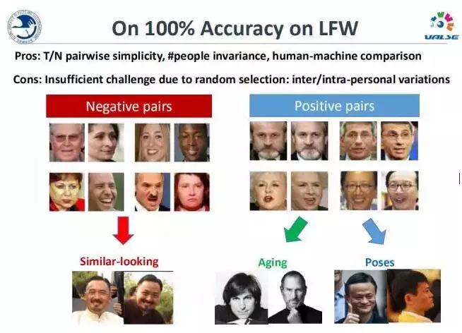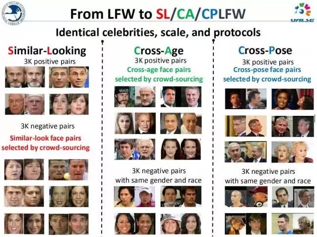 于是,我们尝试在同一名人集合的情况下把LFW的难度加大。从缩小类间差异的角度,利用众包方式从LFW原有图片集合里挑选了一些外貌相似的人脸(比如周润发和他的替身)。从增大类间差异的角度,利用众包方式根据LFW各个folder的名人列表挑选了年龄跨度较大或者姿态跨度较大的图片组(例如乔布斯不同年龄的图片和马爸爸的各种姿态图片)。