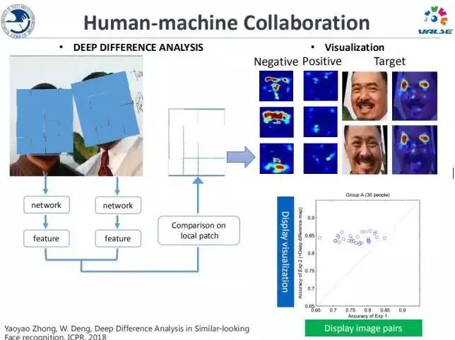 例如,周润发和他的替身的眉毛的外侧就有很大的区别,人很难发现,但深度学习一下子就能标记出来。我们测试了200对人脸图像的验证准确率情况,右下角的这张图是我的学生在看这些可视化的结果之前和之后,他们的识别的变化。看之前30名学生的平均准确率是75%,看之后显著地提高到85%。